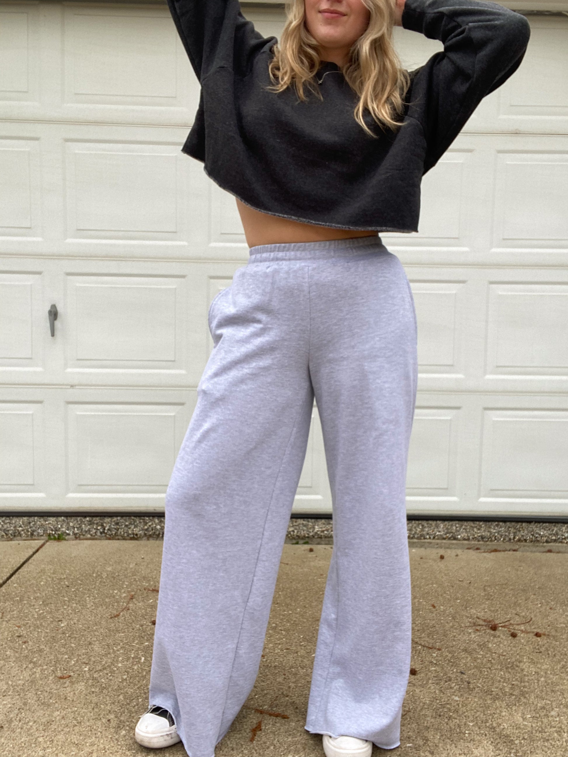 These high-waisted sweatpants feature an elastic waistband, raw edge hem, and a wide-leg design for optimal casual comfort. These are ridiculously comfy and perfect for a lazy day or even working out! Tailor the length of the pants to your preference, and embrace the perfect fit that suits your style.